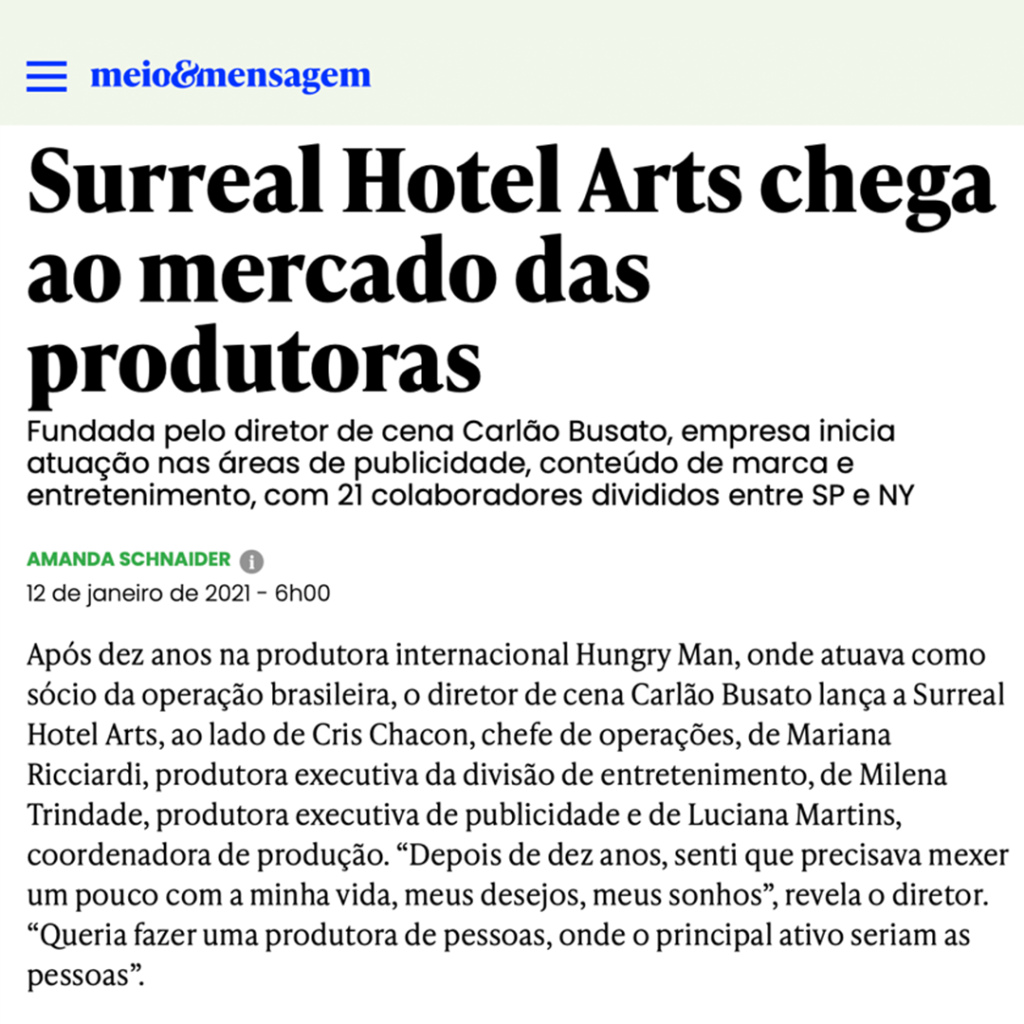 A Surreal Hotel Arts é uma produtora audiovisual brasileira com sedes em São Paulo e Nova York. Atuamos nos mercados nacional e internacional, criando para publicidade, entretenimento e conteúdo de marca. Desde janeiro de 2021, nossa proposta é contar histórias com relevância, liberdade criativa e escuta sensível. Acreditamos no poder de imaginar, criar e construir soluções que reflitam as diferentes vozes do mundo, sempre em diálogo com agências, marcas, distribuidoras, plataformas e outros parceiros do setor. Signatários do Pacto Global da ONU, seguimos comprometidos com os Objetivos de Desenvolvimento Sustentável da Agenda 2030, alinhando nossos projetos a um futuro mais diverso, responsável e conectado com as pessoas.